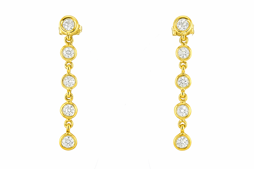 עגילי יהלומים תלויים אלגנטיים, משובצים יהלומים טבעיים במשקל כולל של 1 קראט, בשיבוץ בזל (Bezel) המעניק מראה נקי, מודרני ובטיחותי. השיבוץ הסגור מקיף את היהלומים ומדגיש את צורתם, תוך שמירה על ברק רך ומאוזן.